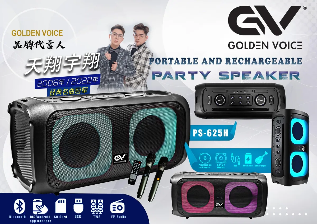 Step into the spotlight with the Golden Voice PS-625H Portable and Rechargeable Party Speaker, proudly endorsed by the renowned ambassadors 天翔宇翔. Designed for dynamic sound lovers, this powerful speaker features dual 6.5" woofers, vibrant LED lighting, and up to 8 hours of continuous playtime. Whether you’re singing karaoke, hosting a party, or just enjoying your favorite tunes, the PS-625H delivers rich bass and crisp vocals with wireless mic support, Bluetooth connectivity, FM radio, USB/SD input, and TWS pairing. Backed by the legacy of classic chart-topping hits from 2006 to 2022, it’s more than a speaker—it’s the life of your celebration.